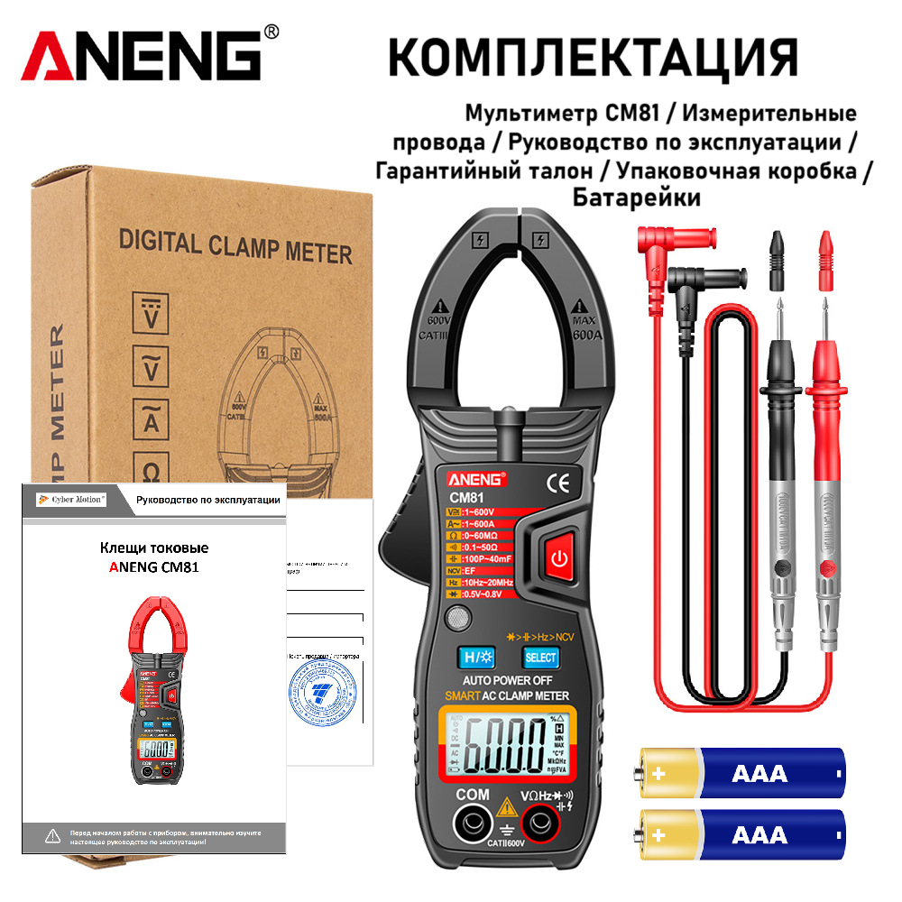Клещи токоизмерительные ANENG CM81 обладают достаточно большим набором функций для удобной и быстрой работы: измерение постоянного и переменного напряжения, переменного тока, сопротивления, ёмкости, частоты, температуры окружающей среды, детектор электромагнитного излучения, определение фаза-ноль, тест диодов, целостность цепи, фиксация значений на экране, автоматическое выключение, подсветка экрана, фонарик.