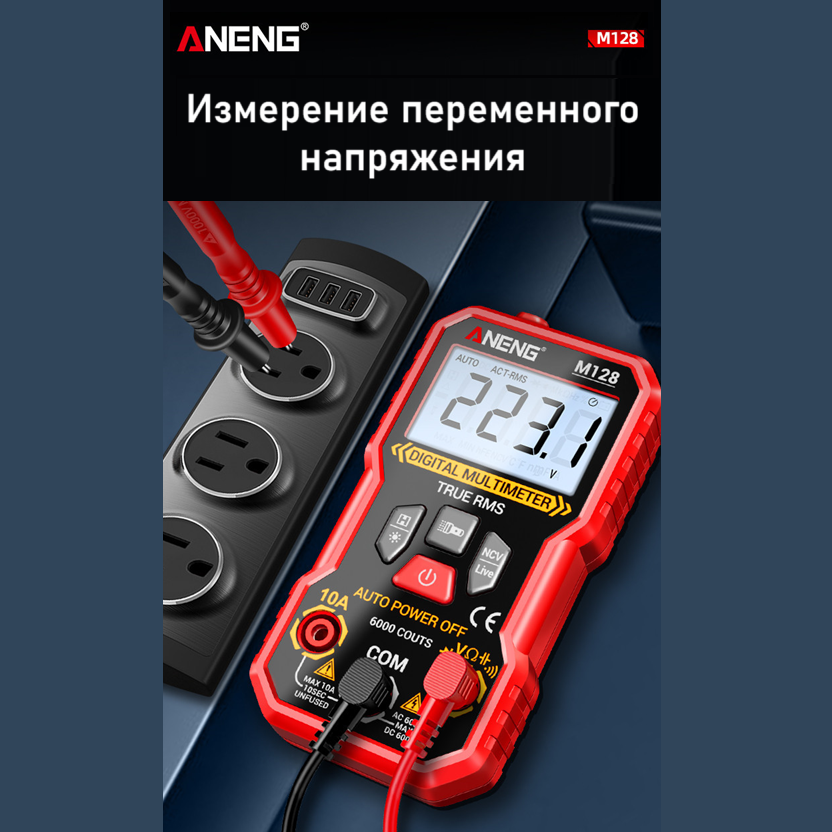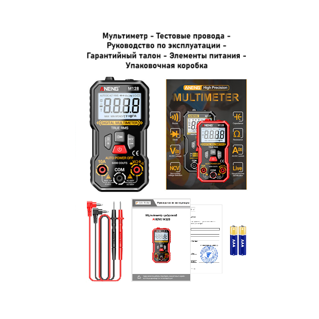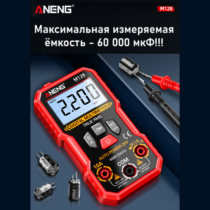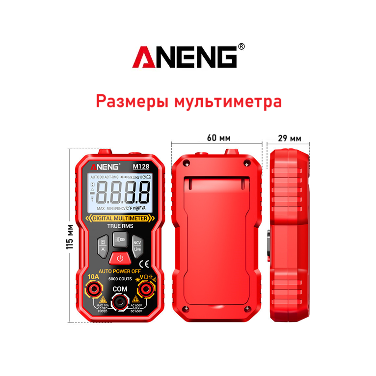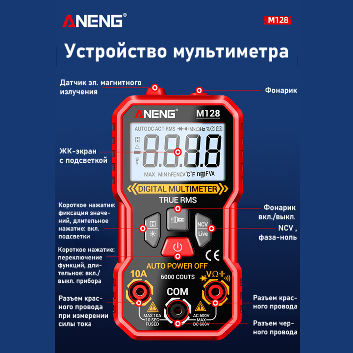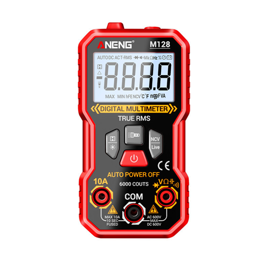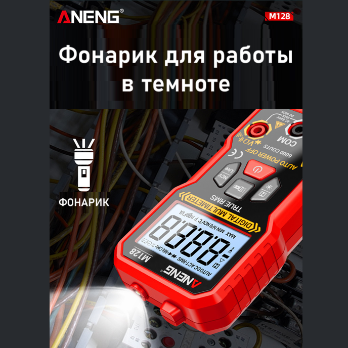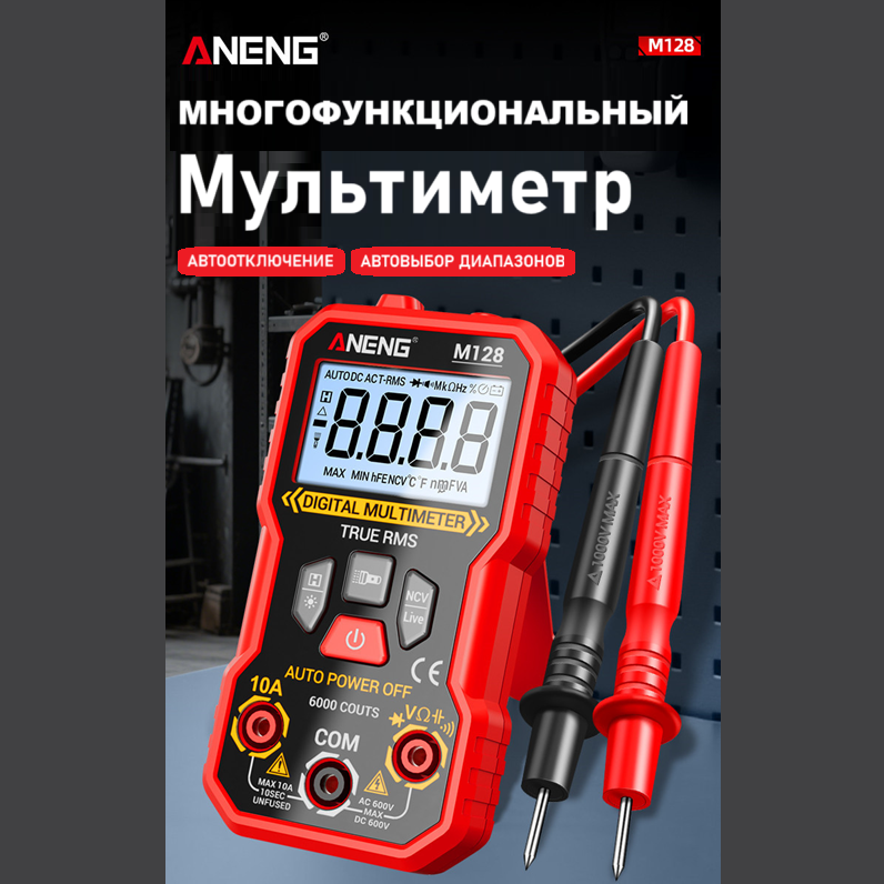 ANENG M128 – портативный цифровой мультиметр, разработанный и изготовленный в соответствии с международными стандартами электробезопасности; предназначен для измерения переменного и постоянного напряжения и тока, сопротивления, ёмкости, тестирования диодов, проверки целостности цепи, наличия электромагнитного излучения, поиска фазы и др.