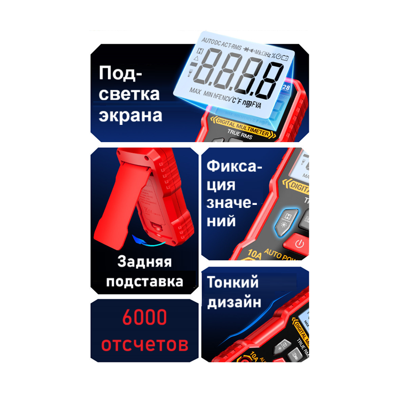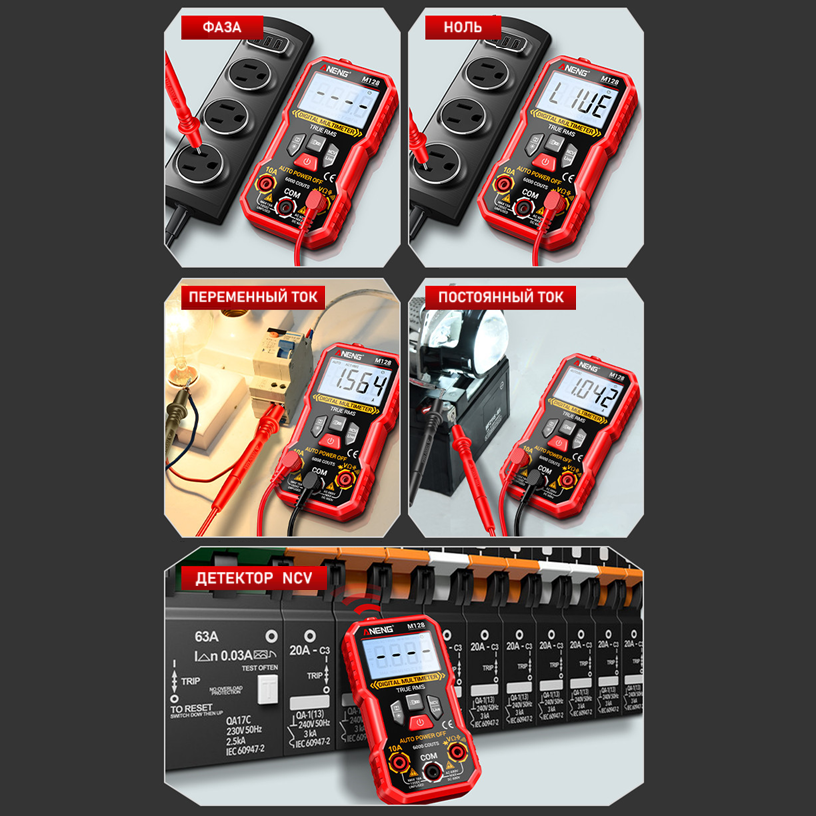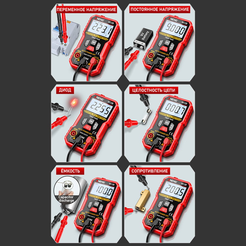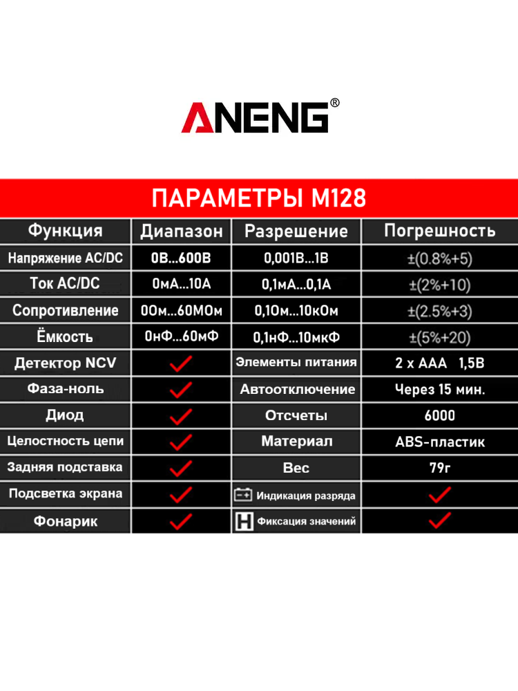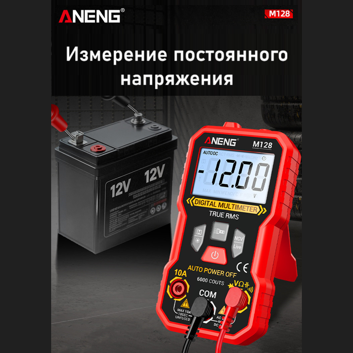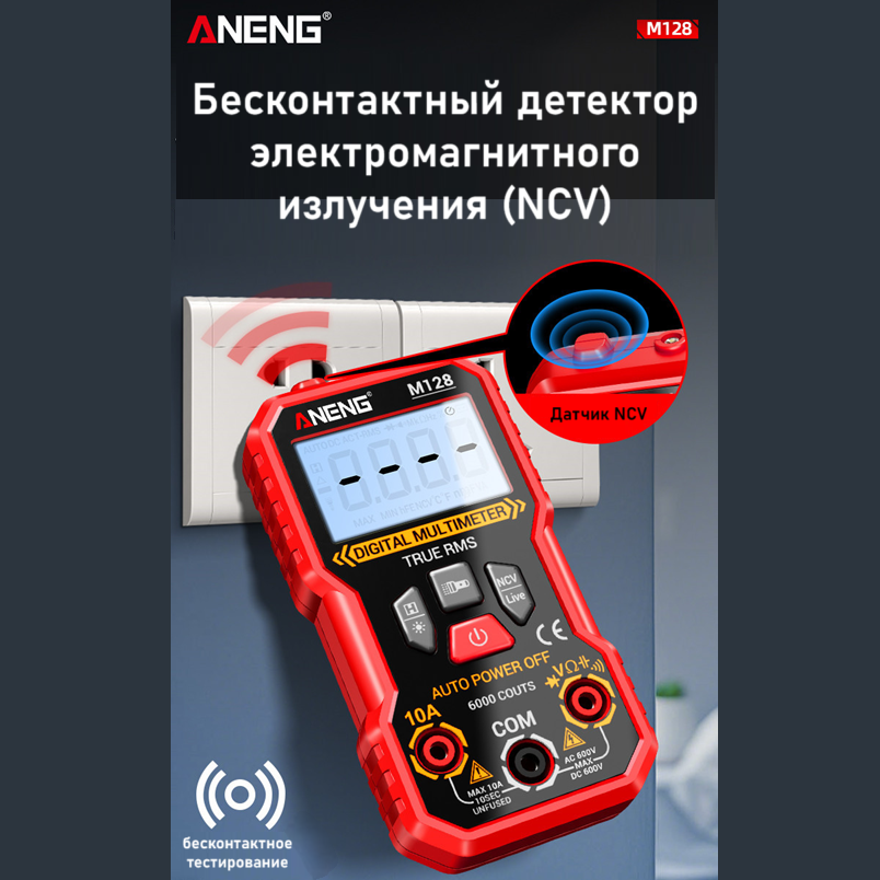 ANENG M128 – портативный цифровой мультиметр, разработанный и изготовленный в соответствии с международными стандартами электробезопасности; предназначен для измерения переменного и постоянного напряжения и тока, сопротивления, ёмкости, тестирования диодов, проверки целостности цепи, наличия электромагнитного излучения, поиска фазы и др.