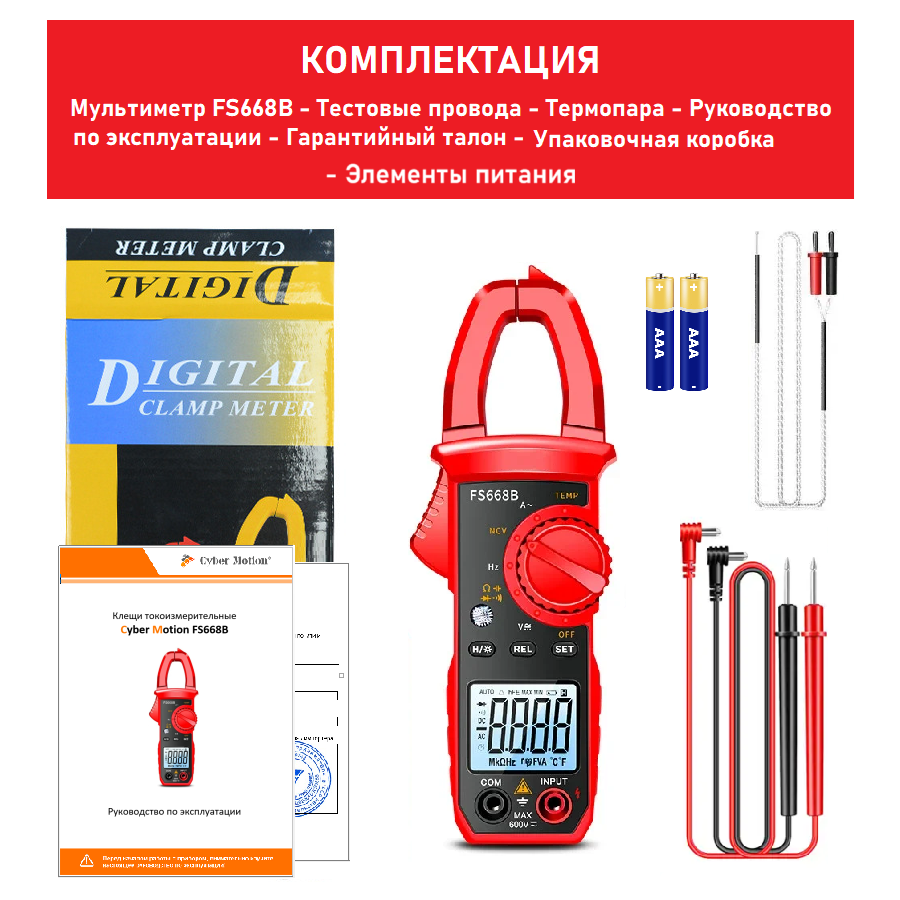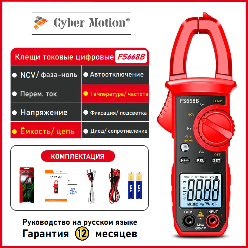 Клещи токоизмерительные FS668B с ручным переключателем функций и автоматическим выбором диапазонов обладают достаточным набором функций для удобной и быстрой работы: измерение постоянного и переменного напряжения, переменного тока, сопротивления, ёмкости, частоты, температуры, детектор электромагнитного излучения, определение фаза-ноль, тест диодов, целостность цепи, фиксация значений на экране, автоматическое выключение, подсветка экрана.